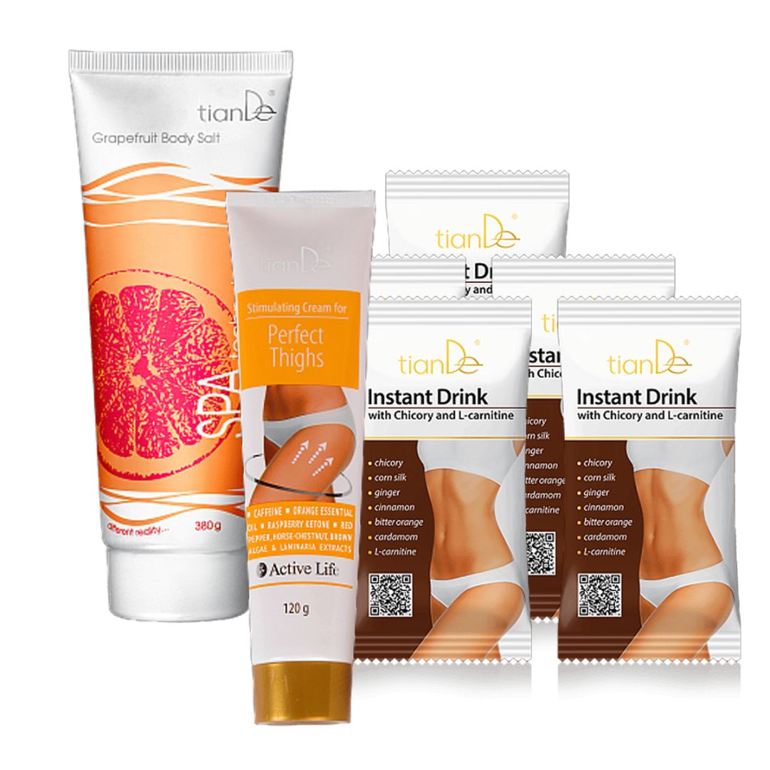 Krásna postava vyžaduje komplexný prístup. Táto voňavá telová soľ pomôže zlepšiť tón a textúru pokožky, Stimulačný krém pre dokonalé stehná účinne pôsobí na problémové partie a Instantný nápoj s čakankou a L-karnitínom* prispeje k vášmu metabolizmu. Kúpte si túto sadu za skvelú cenu! Pre dosiahnutie úžasných výsledkov nezabudnite na cvičenie.