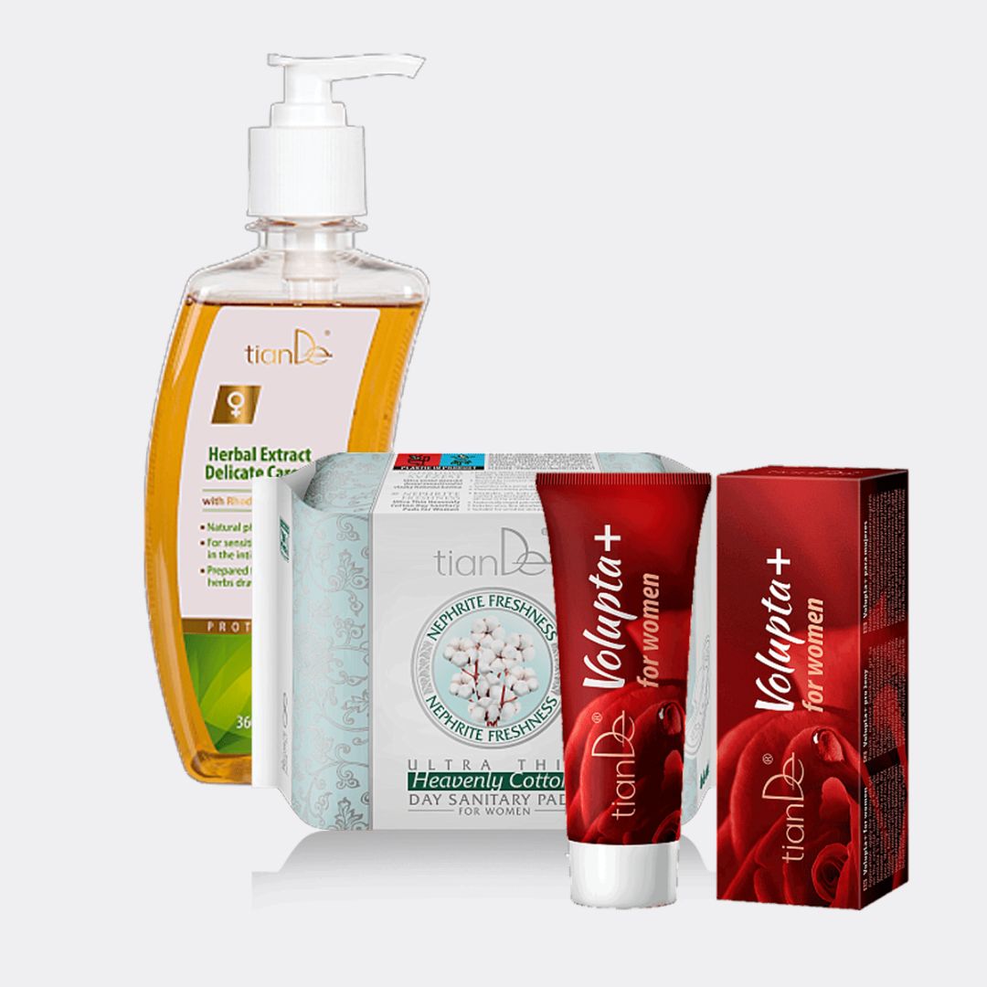 Medzi špičkové produkty spoločnosti TianDe patria jemné gély na starostlivosť a hygienické vložky, ktoré ženám zaručujú nielen pohodlie, ale aj dobré zdravie! Ultra tenké hygienické vložky, vyrobené z vysoko kvalitných materiálov, ktoré zabraňujú skleníkovému efektu, a jemný gél na starostlivosť s bylinným výťažkom, ktorý posilňuje lokálnu imunitu – kúpte si sadu pre vysokú kvalitu hygieny a získajte bonus Volupta+ pre intenzívnejšie zmyslové zážitky.