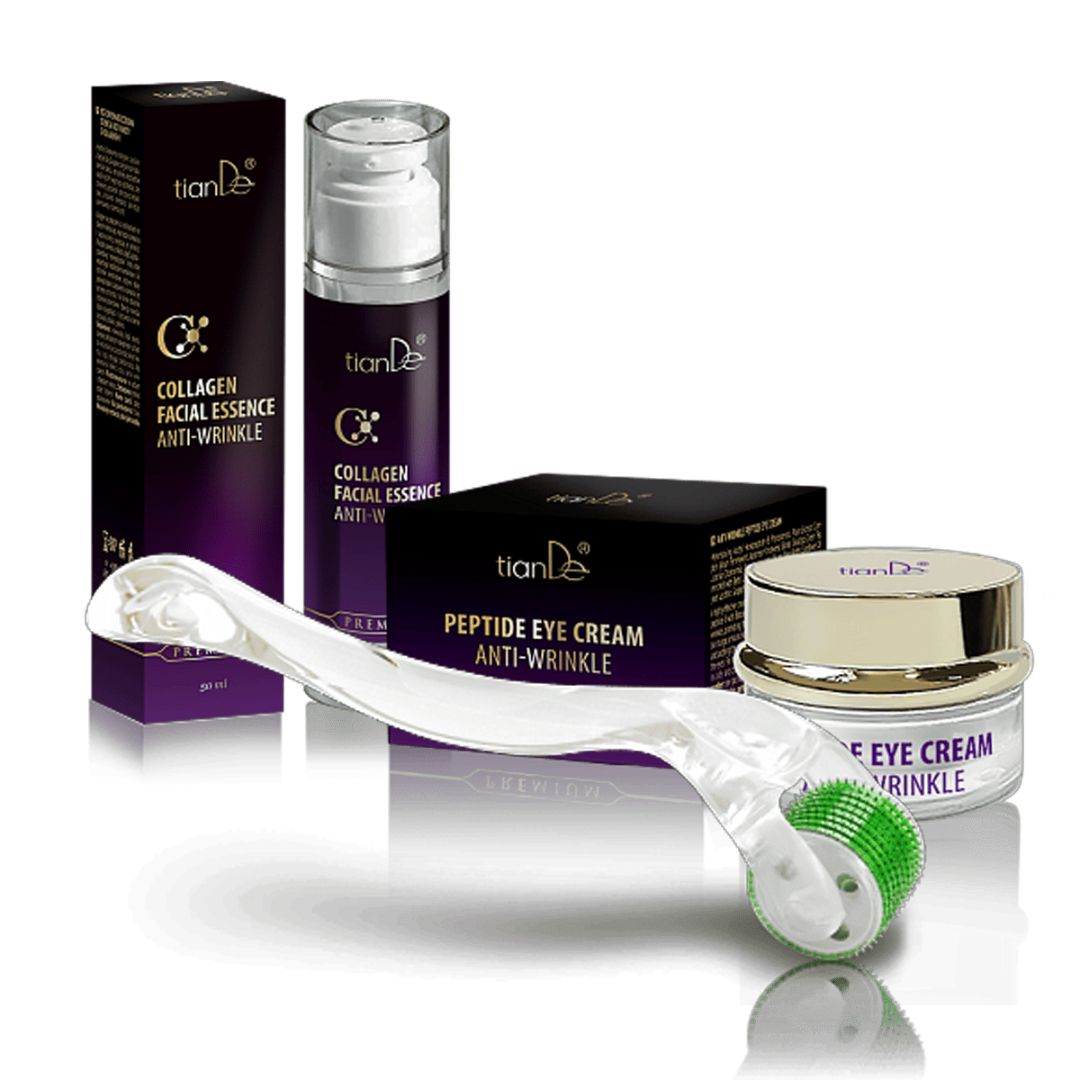 Kúpte 2 produkty: Anti-vrásková kolagénová esencia na tvár + anti-vráskový peptidový krém na oči – získajte masážny valček Mezoroller ZADARMO!